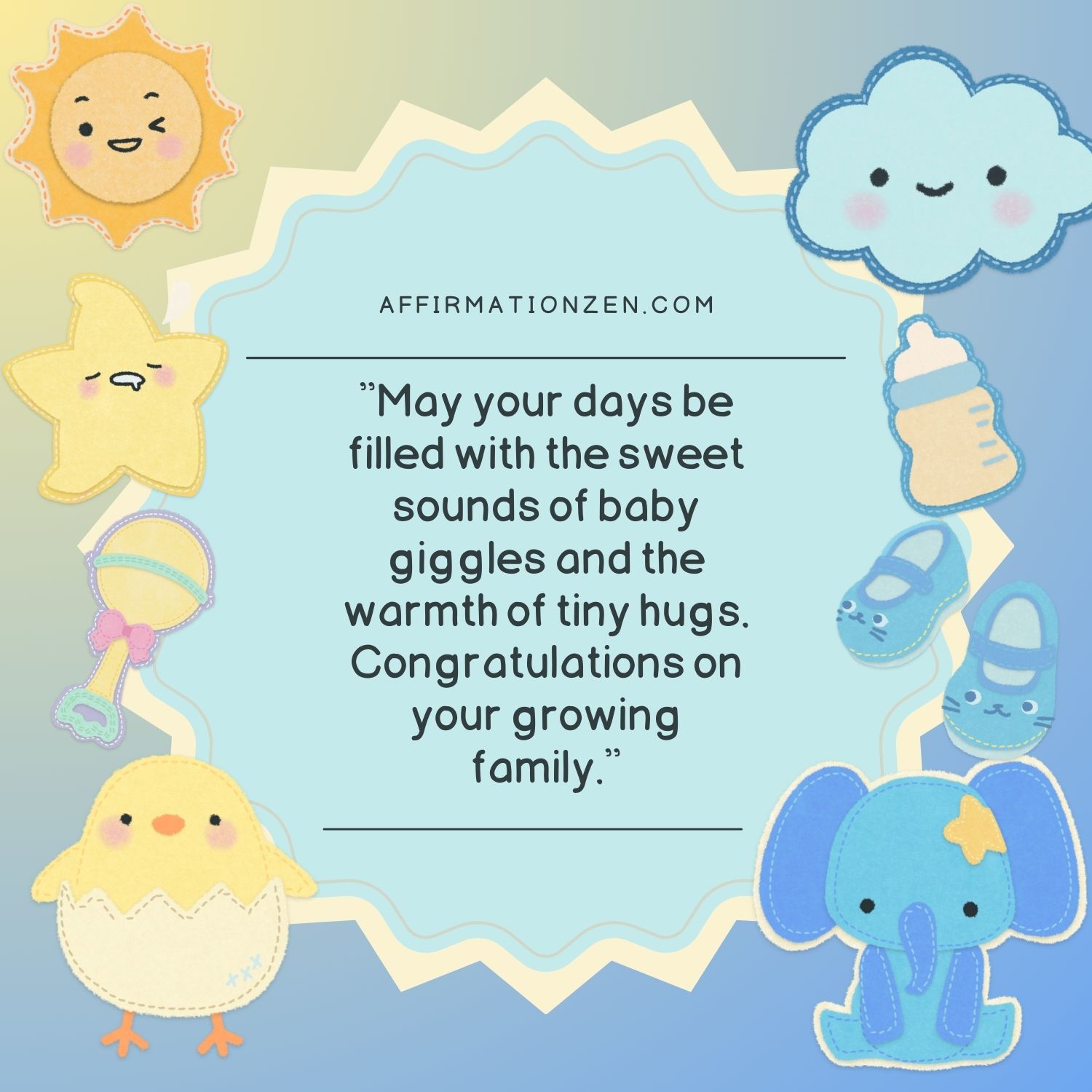 ◼ “May your days be filled with the sweet sounds of baby giggles and the warmth of tiny hugs. Congratulations on your growing family.”