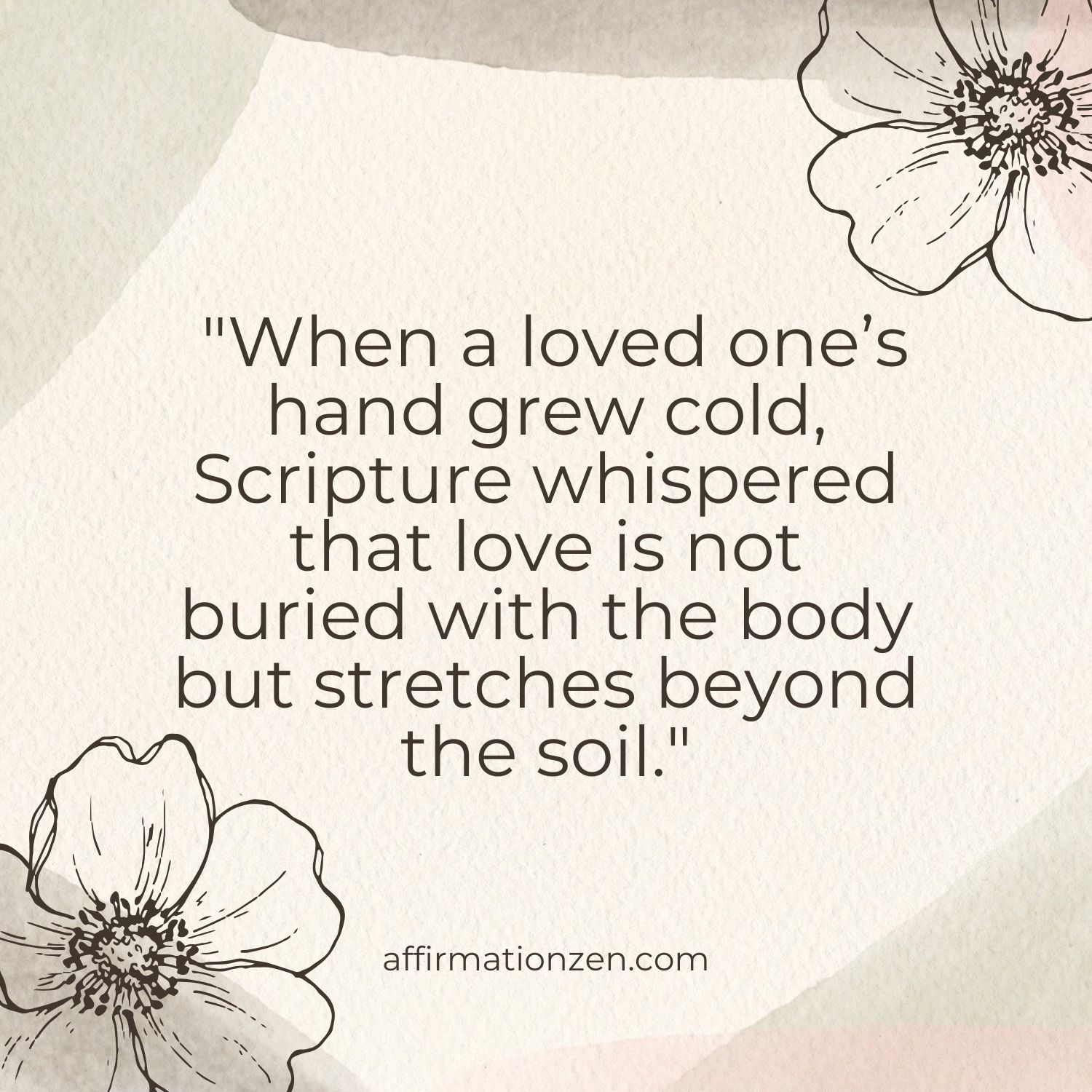 ◼ “When a loved one’s hand grew cold, Scripture whispered that love is not buried with the body but stretches beyond the soil.”