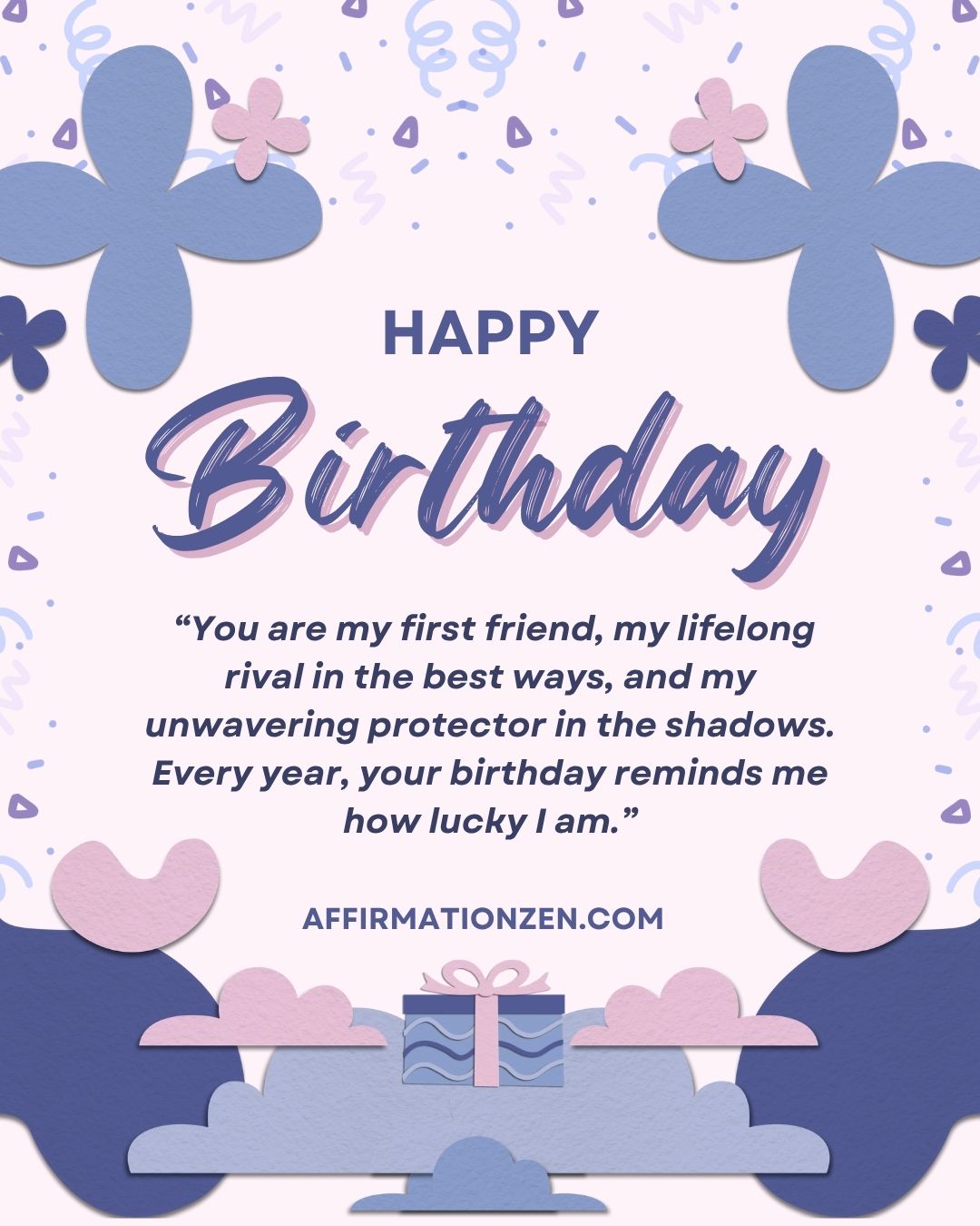 ◼ “You are my first friend, my lifelong rival in the best ways, and my unwavering protector in the shadows. Every year, your birthday reminds me how lucky I am.”